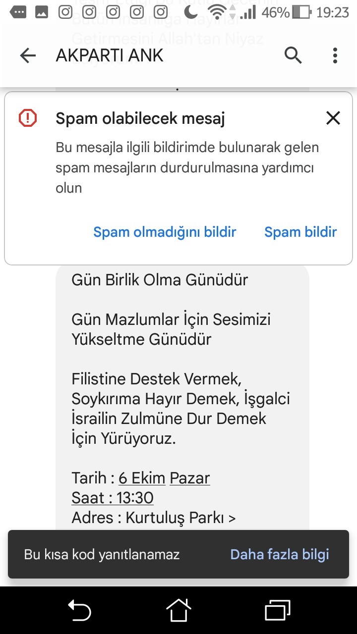 Son olarak AK Parti Ankara İl Başkanı Hakan Hak Özcan’ın, AK Parti Ankara İl Başkanlığı’nın da destek verdiği “Filistin’e destek vermek, soykırıma hayır demek, işgalci İsrail’in zulmüne dur demek için” yarın Ankara’da yapılacak olan büyük yürüyüşe davet amacıyla gönderdiği mesaj, Whatsapp tarafından “spama” düşürüldü.