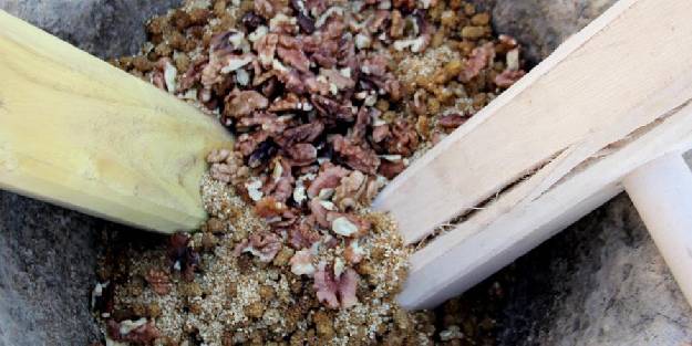 Dut çekmesinin içerisine susam ve ceviz konularak dibeklerde karşılıklı dövülür. Yüzyıllar boyunca süre gelen bir örftür, bir gelenektir.