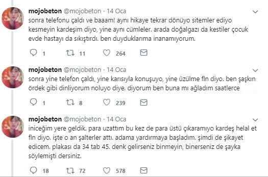İşte Mojobetton kullanıcı ismiyle olayı anlatan sosyal medya kullanıcısının tweetleri: