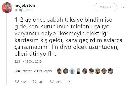 Twitter'da "mojobetton" kullanıcı ismiyle paylaşım yapan bir vatandaş, bindiği taksi sürücüsünün telefonda konuşur gibi yaparak "kesmeyin elektriği" diye yalvarmasından çok etkilendi. Taksicinin haline üzülerek parasının üstünü almayan vatandaş, kısa bir süre sonra tekrar aynı taksiye bindi. Sürücünün yine aynı şekilde telefonla konuşmasına şahit olan vatandaş bunun bir dolandırıcılık yöntemi olduğunu fark etti.