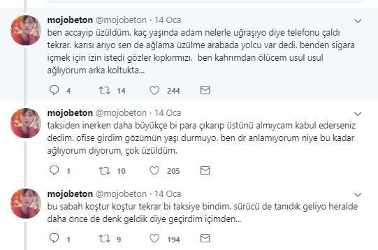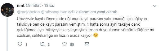 Tweetleri yüzlerce beğeni alan sosyal medya kullanıcısına yorum yapan diğer vatandaşlar, aynı şeyleri yaşadıklarını dile getirdi. Oğlunu üniversitede okuttuğunu söyleyen bir taksiciye yardım eden "nmtkrt" kullanıcı isimli vatandaş yaşadıklarını şöyle anlattı: