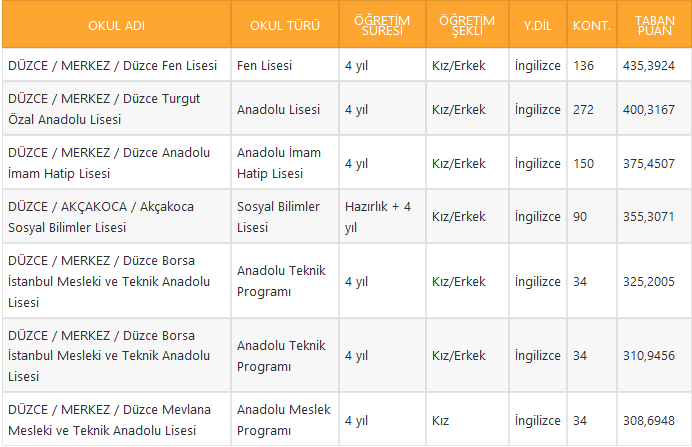 Düzce liseleri taban puanı 2021 Düzce liseleri başarı sıralaması |Düzce liseleri kontenjanları