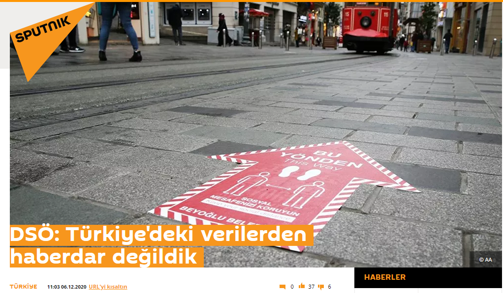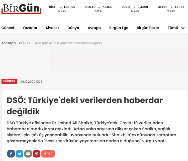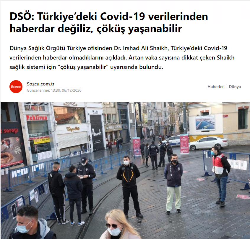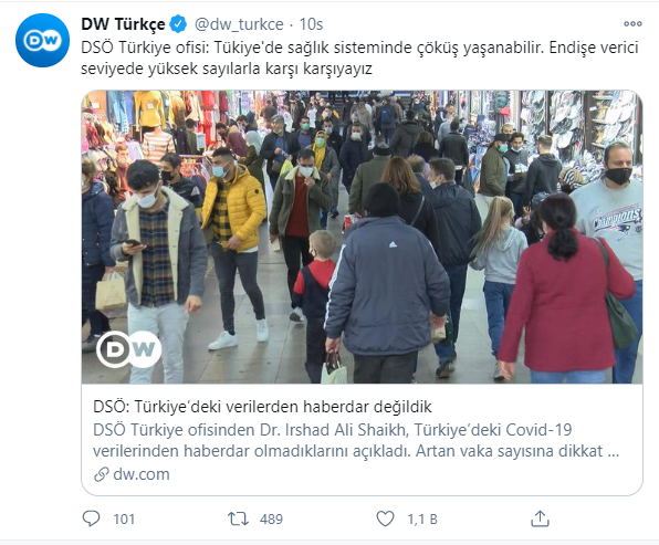 World Health Organization Turkey (DSÖ Türkiye) ofisinden Dr. Irshad Ali Shaikh ile pandemi sürecine ilişkin bir röportaj yapan Almanya merkezli DW Türkçe, röportajı aslından çarpıtarak 'DSÖ: Türkiye’deki verilerden haberdar değildik' başlığı ile yayımladı. DW Türkçe'nin haberini rehber edinen muhalif medya da yalanı yaymak için birbiri ile yarıştı.
