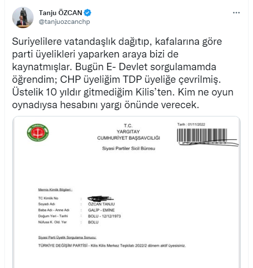 Twitter hesabından ekran görüntüsü paylaşan ırkçı Özcan, "CHP üyeliğim TDP üyeliğine çevrilmiş. Üstelik 10 yıldır gitmediğim Kilis’ten." dedi.