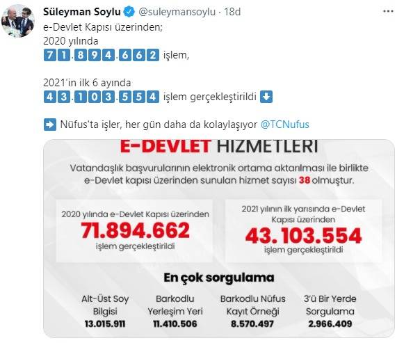 İçişleri Bakanı Süleyman Soylu E-Devlet üzerinden 2020 yılında ve 2021 yılının ilk altı ayında yapılan işlemlere dair verileri paylaştı. Soylu sosyal medya hesabından yaptığı paylaşımda, e-Devlet Kapısı üzerinden; 2020 yılında 71 milyon 894 bin 662 işlem yapıldığını 2021 yılının ilk altı ayında ise 43 milyon 103 bin 554 işlem yapıldığını duyurdu.