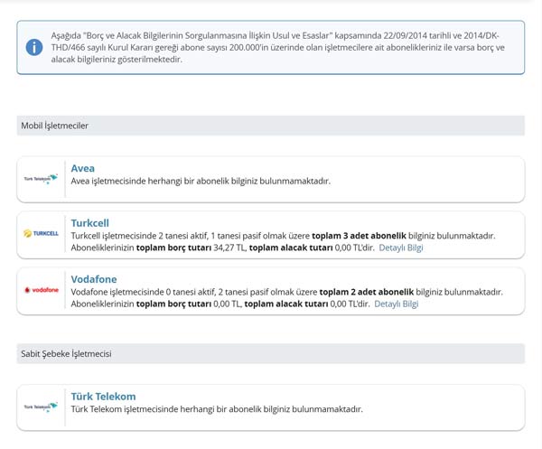 "Borç ve Alacak Bilgilerinin Sorgulanmasına İlişkin Usul ve Esaslar" kapsamında 22/09/2014 tarihli ve 2014/DK-THD/466 sayılı Kurul Kararı gereği abone sayısı 200 binin üzerindeki işletmecilere ait borç ve alacak bilgileri e-Devlet üzerinden sorgulanabiliyor.