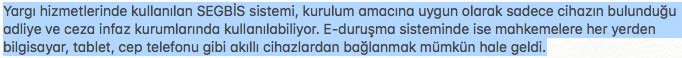 Adalet Bakanlığı büyük bir çalışmaya imza attı. Yargı Reformu Strateji Belgesi kapsamında adliyeler de dijital dönüşüme geçiyor. Yeni adli yılın açılmasıyla birlikte hayata geçen e-duruşmanın pilot uygulaması, Ankara Batı Adliyesi'nde yapılmaktaydı. Adalet Bakanlığı e duruşma sisteminin Türkiye genelinde yaygınlaştırılması için altyapı çalışmalarını sürdürürken, e-duruşmayı Ankara, İstanbul, İstanbul Anadolu ve Bakırköy adliyelerindeki tüketici mahkemelerinde hayata geçiyor. Sistemin kurulumu tamamlanan 42 mahkemede e-duruşma bu haftadan itibaren yapılacak. Adalet Bakanlığı, e-duruşmanın yapıldığı mahkeme sayısını yıl sonuna kadar 200 mahkemeye çıkarmayı, 2021'de uygulamayı Türkiye genelinde yaygınlaştırmayı hedefliyor.