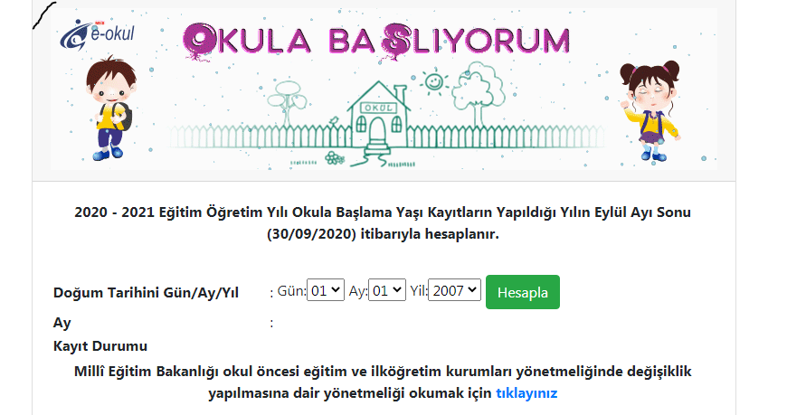 Birinci sınıf ve beşinci sınıf öğrencilerinin velileri hangi okulda çocuklarının eğitim göreceği heycanını yaşarken, bazı anne ve babalarda acaba çocuğumun okula başlama yaşı geldimi diye merak ediyor. Çocuğunuzun eğitim yaşının gelip gelmediğini yine MEB tarafından hizmet veren e okul sistemi üzerinden kolaylıkla sorgulama yapabilirsiniz. Sorgulama yapmak için tıklayınız.