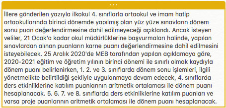 Milli Eğitim Bakanlığından (MEB) yapılan açıklamaya göre, Kovid-19 salgını tedbirleri kapsamında uzaktan eğitim süreci, okullardaki sınavlar ve yarıyıl tatili takvimiyle ilgili bazı düzenlemeler yapılmıştı. İlkokul, ortaokul ve liselerde uzaktan eğitim, 2020-2021 eğitim öğretim yılının ilk döneminin tamamlanacağı 22 Ocak 2021 Cuma gününe kadar devam edecek. Ayrıca, 25 Ocak 2021 Pazartesi günü başlayacak yarıyıl tatil süresine ikinci dönemdeki bir haftalık ara tatil süresi de eklenecek. 2020-2021 eğitim öğretim yılının ikinci dönemi 15 Şubat 2021 Pazartesi günü başlayacak.