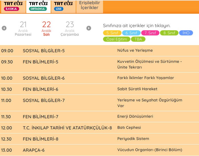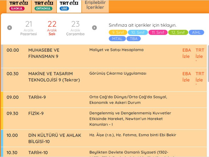 EBA 22 Aralık Salı ders programı EBA canlı ders saatleri