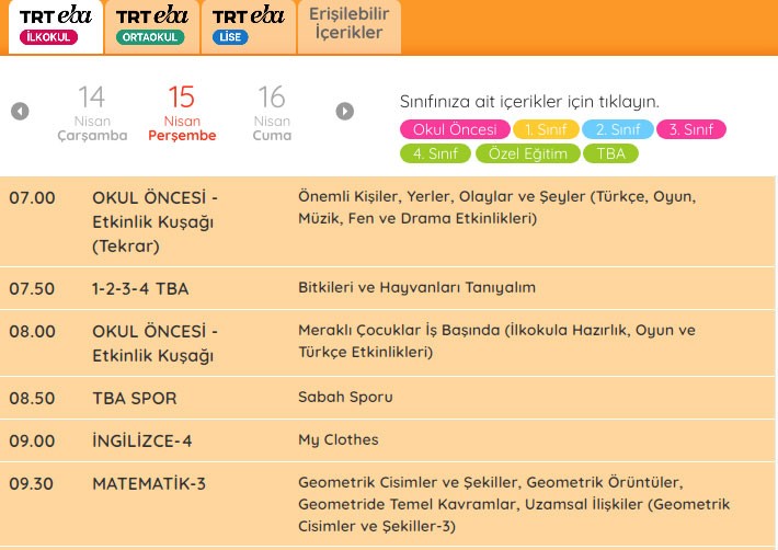 EBA ilkokul canlı ders saatleri 15 Nisan Perşembe