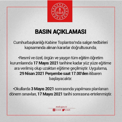 Cumhurbaşkanlığı Kabine Toplantısı'nda salgın tedbirleri kapsamında 29 Nisan - 17 Mayıs tarihleri arasında tam kapanma uygulanacak. Alınan yeni korona kısıtlamalarına ilişin açıklama yapan Cumhurbaşkanı Erdoğan yüz yüze eğitim ve sınavlar hakkında da önemli bir açıklamada bulundu. Yüz yüze eğitimle ilgili alınan kararları açıklayan Erdoğan, "Anaokulu, kreş, 8. ve 12. sınıflar dahil tüm kurumlarda yüz yüze eğitime ara verilecek. Tüm sınavlar ertelenecek." dedi. Başkan Erdoğan’ın açıklaması sonrası da Milli Eğitim Bakanlığı (MEB) tam kapanmaya yönelik uzaktan eğitim açıklaması yaptı. Peki tam kapanma tarihlerinde EBA TV canlı ders olacak mı? İşte detaylar...