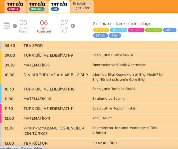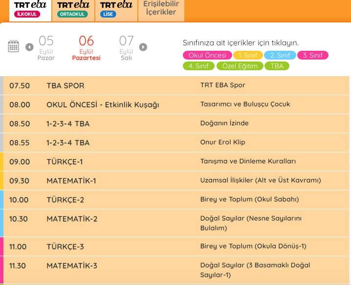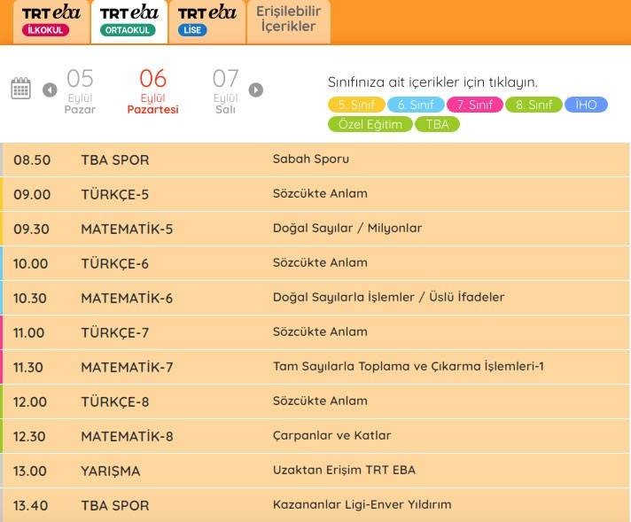 EBA ders saatleri 6 Eylül Pazartesi ilkokul, ortaokul, lise