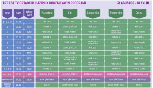 31 Ağustos Pazartesi günü uzaktan eğitimle ders başı yapan ayen geçen yıl olduğu gibi yine TRT EBA TV üzerinden canlı dersleri izleme olanağına sahip oldu. TRT EBA TV üzerinden yayınlanacak derslere ilişkin ders programı da yine hem öğrenci hem de veliler tarafından sorgulanmakta. EBA TV ders programı ve ders saatleri Milli Eğitim Bakanlığı (MEB) tarafından yayınlandı. MEB tarafından açıklanan ders programı 31 Ağustos 18- Eylül tarihleri arasındaki ders program sayesinde öğrenciler hangi dersi saat kaçta işleyeceklerinin yanında ders tekrarlarının hangi saatler arasında yapılacağını da öğrenebiliyor.