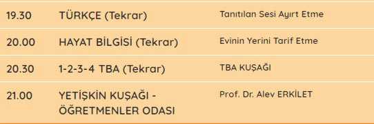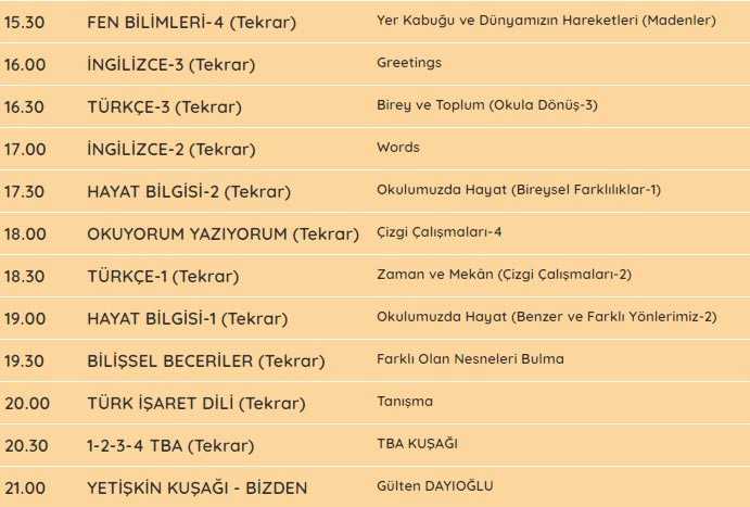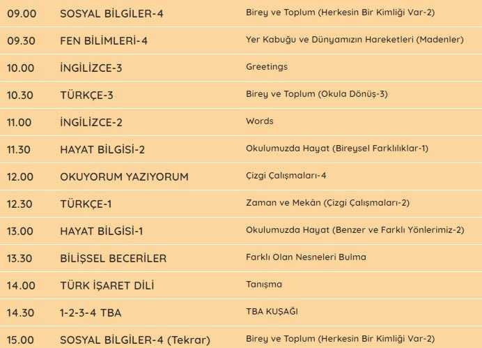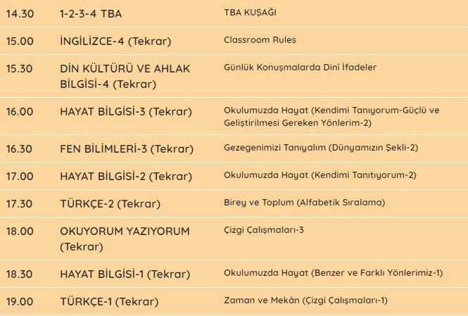 TRT EBA TV tüm sınıfların ders programı için tıklayınız