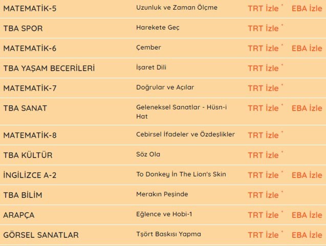 EBA ders programı MEB ilkokul ortaokul lise TRT EBA TV ders programı