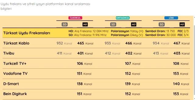TRT EBA TV frekans bilgiler