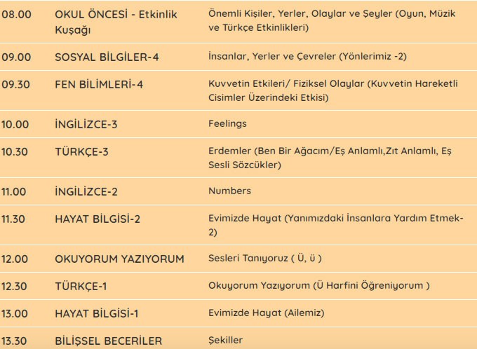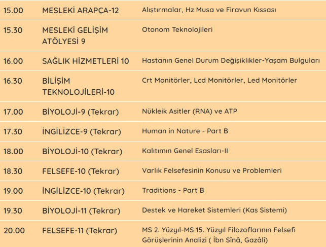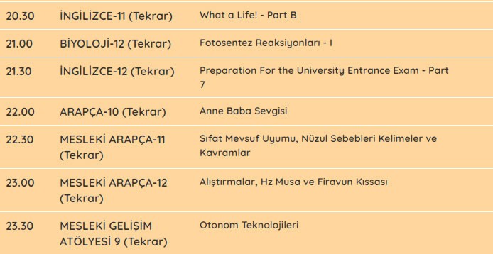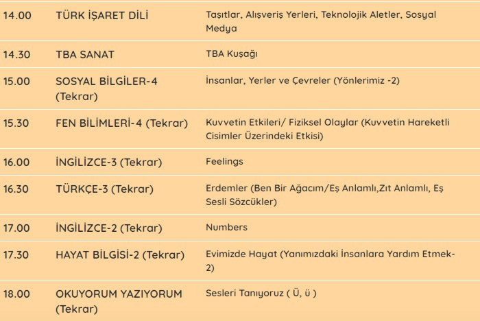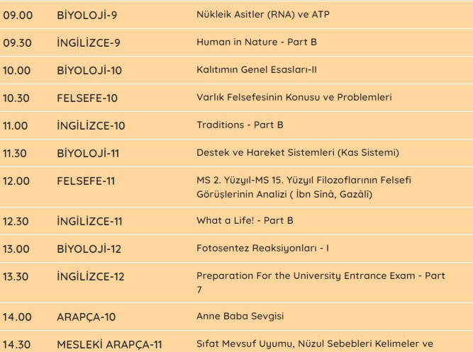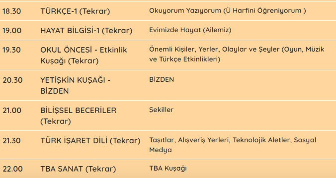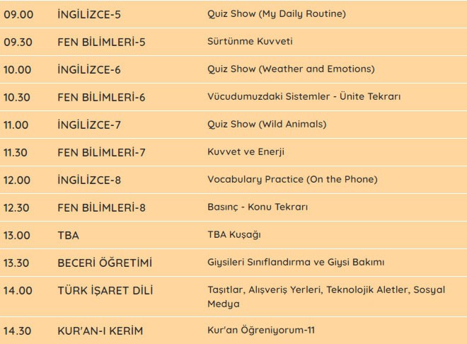 EBA ders saatleri öğrenciler tarafından sorgulanmakta. TRT EBA TV'de canlı dersleri milyonlarca öğrenci takip ediyor. İlkokul, ortaokul ve lise öğrencileri için TRT EBA TV ders programı Milli Eğitim Bakanlığı tarafından EBA internet sitesi üzerinden açıklandı. Haftanın son ders günü olan 11 Aralık Cuma günü EBA TV canlı ders saatleri ders programı aşağıda yerl almaktadır.