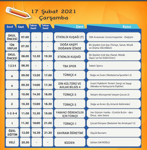 EBA TV ilkokul canlı ders saatleri 17 Şubat