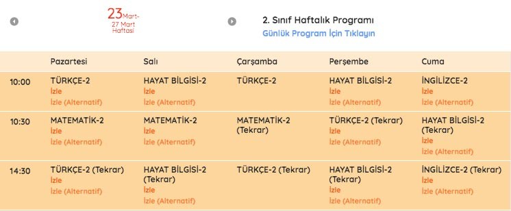 TRT EBA TV Canlı ders izle. 23 Mart Pazartesi günü milyonlarca öğrenci TRT EBA TV İlkokul, EBA TV Ortaokul ve EBA TV Lise uzaktan eğitime başlayacak. Milli Eğitim Bakanlığı (MEB), uzaktan eğitimde kullanılacak TRT-EBA TV'nin yayın programını açıkladı. İşte EBA TV 2. Sınıf günlük haftalık ders program EBA TV ders yayını.