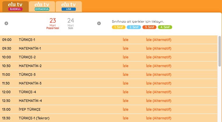Öğrenciler için EBA TV İlkokul, EBA TV Ortaokul ve EBA TV Lise ile 23 Mart Pazartesi gününden itibaren uzaktan eğitime başlayacak. Dersler, EBA TV İlkokul ve EBA TV Ortaokul'da sabah saat 09.00'da başlayıp 13.30'a kadar devam edecek. Ayrıca saat 13.30- 17.30 ve 17.30- 21.30'da iki kez tekrar yayın ekrana gelecek.