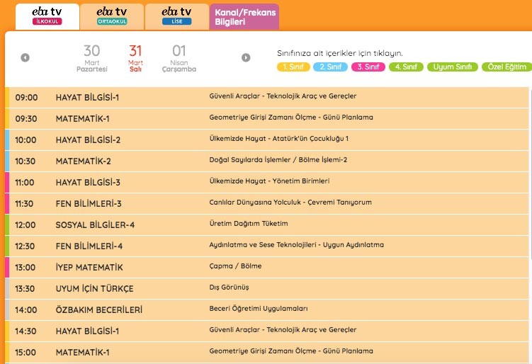 Uzaktan eğitim 30 Nisan’a kadar uzatıldı. Milli Eğitim Bakanlığı uzaktan eğitimin uzatmasıyla birlikte TRT EBA TV 1.sınıf, 2. Sınıf, 3. Sınıf, 4. Sınıf, uyum sınıfı, özel eğitim sınıfı ders programı ve ders saati ile EBA TV ortaokul 5. Sınıf, 6. Sınıf, 7. Sınıf, 8. Sınıf, İHO, uyum sınıfı ve özel eğitim sınıfı ders programı ve ders saati ile birlikte TRT EBA TV lise 9. Sınıf, 10. Sınıf, 11. Sınıf, 12. Sınıf, AİHL ve uyum sınıfı günlük haftalık ders programı ve ders saati merak edilmekte. Milli Eğitim Bakanlığı (MEB) EBA TV ilkokul, ortaokul ve lise ders programını yayınladı. İşte 31 Mart Salı ders programı ve ders saatleri başta olmak üzere EBA TV günlük ve haftalık ders programı sorgulama ekranı…
