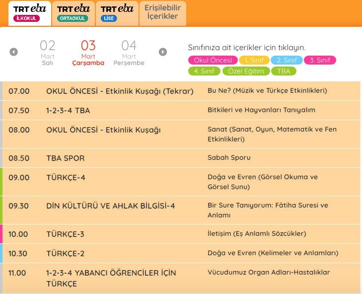 EBA TV canlı ders programı ilkokul, EBA TV canlı ders saatleri