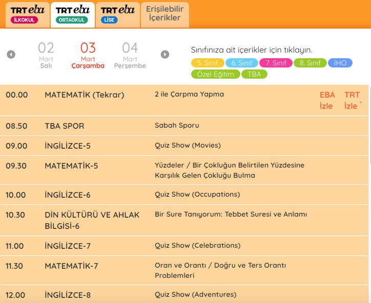 EBA TV canlı ders programı ortaoku, EBA TV ortaokul canlı ders saatleri