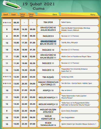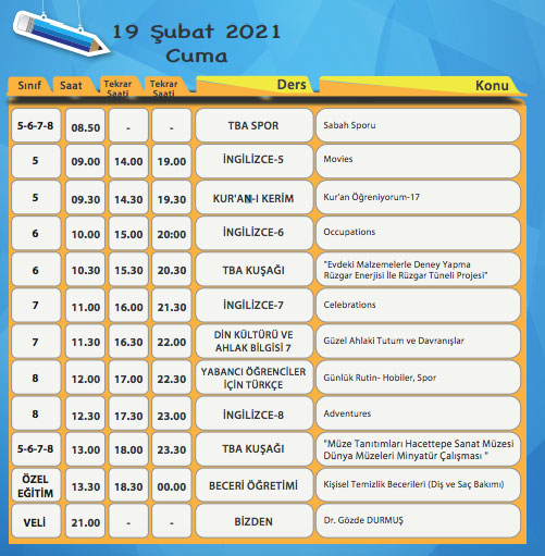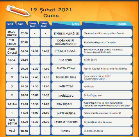 EBA TV 19 Şubat 2021 Cuma gününün ders programı belli oldu. Milli Eğitim Bakanlığı TRT EBA TV canlı yayın dersi için TRT EBA ilkokul yayı yayın akışı, EBA TV ortaokul yayın akışı ile TRT EBA TV lise canlı yayın akışı ders saatlerini EBA üzerinden yayınladı. İşte EBA TV 19 Şubat Cuma ders programı EBA TV canlı ders saatleri.