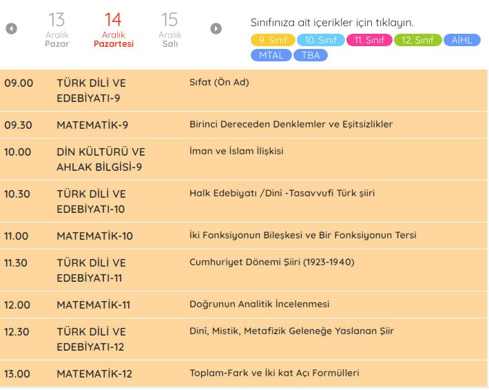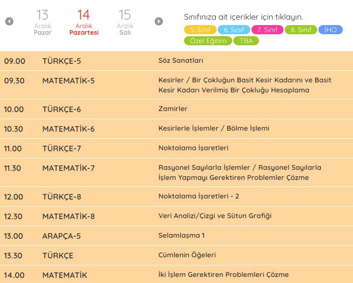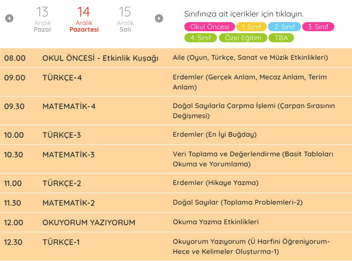EBA TV ilkokul, ortaokul ve lise canlı ders programı ders saatleri TRT EBA 14-20 Aralık