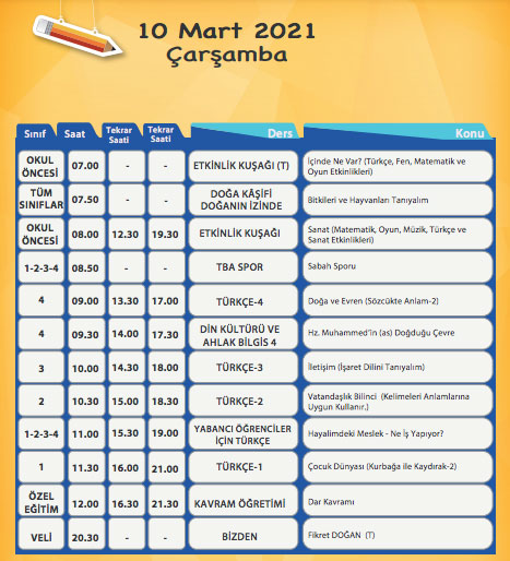 Yüz yüze eğitime devam etmeyen öğrenciler TRT EBA TV üzerinden canlı ders işlemekte. EBA TV'de 10 Mart 2021 Çarşamba ilkokul, ortaokul ve lise canlı ders saatleri ve programı da belli oldu. TRT EBA TV ilkokulda ilkokul öğrencileri için Türkçe, Matematik, Hayat Bilgisi, Fen Bilimleri, Din Kültürü ve Ahlak Bilgisi, İngilizce dersleri veriliyor. TRT EBA TV Ortaokulda ortaokul öğrencileri için Türkçe, matematik, sosyal bilgiler, fen bilimleri, din kültürü ve ahlak bilgisi, İngilizce canlı ders yayınları sürerken ve imam hatip ortaokulu öğrencileri için Arapça dersleri işleniyor.. TRT EBA TV Lisede lise öğrencileri için tarih, coğrafya, Türk dili ve edebiyatı, matematik, fizik, kimya, biyoloji, din kültürü ve ahlak bilgisi ve ayrıca imam hatip lisesi öğrenciler için de diğer temel dersler görülmekte.