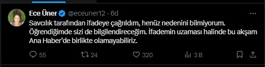 "Savcılık tarafından ifadeye çağrıldım, henüz nedenini bilmiyorum. Öğrendiğimde sizi de bilgilendireceğim. İfademin uzaması halinde bu akşam Ana Haber’de birlikte olamayabiliriz."