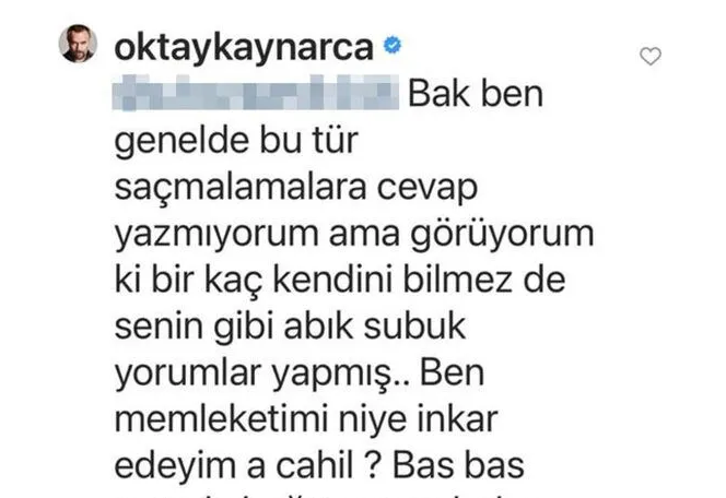 Sosyal medyada yapılan bu yoruma yanıt veren oyuncu, "Bak ben genelde bu tür saçmalamalara cevap yazmıyorum ama görüyorum ki birkaç kendini bilmez de senin gibi abuk sabuk yorumlar yapmış. Ben memleketimi niye inkar edeyim a cahil?