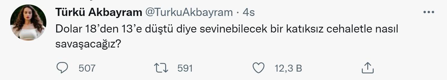 Türkü Akbayram, Cumhurbaşkanı Recep Tayyip Erdoğan'ın yeni ekonomi modelini açıklamasından sonra dolar/TL kurundaki sert düşüş üzerinden, ülke menfaatlerini gözetip Erodğan'ın yanında saf tutan vatandaşları, çirkin ifadelerle hedef aldı.