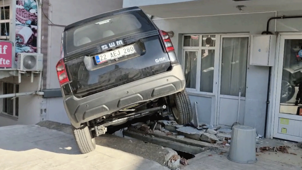 Edirne'de sürücüsünün direksiyon hakimiyetini kaybeden bir cip, uçarak bir evin balkonunu yıktı. Balkonda asılı kalan cipin sürücüsü yaralandı.