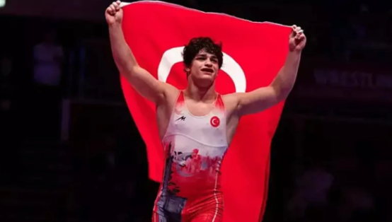 Milli güreşçinin şampiyonluğunu bozkurt selamıyla kutlaması dikkat çekti..