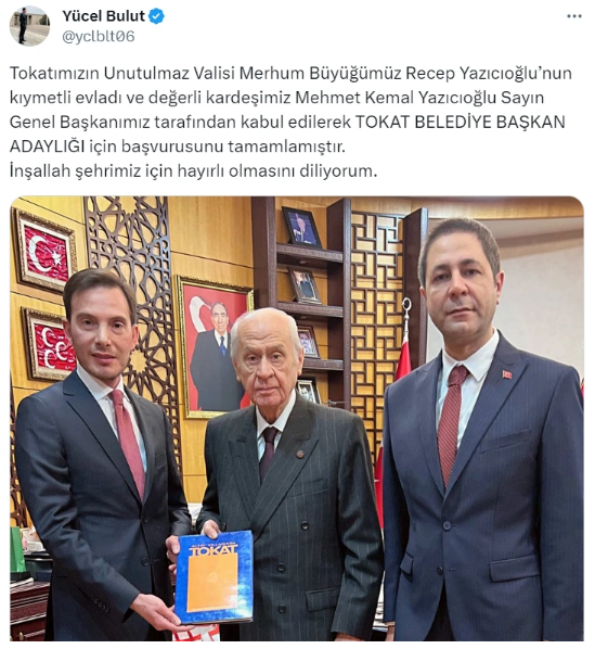 HAYIRLI OLSUN. Tokat’ımızın Unutulmaz Valisi Merhum Büyüğümüz Recep Yazıcıoğlu’nun kıymetli evladı ve değerli kardeşimiz Mehmet Kemal Yazıcıoğlu Sayın Genel Başkanımız tarafından kabul edilerek TOKAT BELEDİYE BAŞKAN ADAYLIĞI için başvurusunu tamamlamıştır. İnşallah şehrimiz için hayırlı olmasını diliyorum.” diyerek paylaşım gerçekleşti.