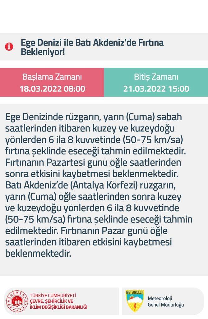 Ülkemiz genelinde hava sıcaklığı mevsim normallerinin altında seyrederken Meteoroloji Genel Müdürlüğü Ege Denizi ile Batı Akdeniz’de fırtına uyarısında bulundu. Genel Müdürlükten yapılan açıklamada; “Ege Denizi ile Batı Akdeniz'de Fırtına Bekleniyor! Başlama Zamanı 18.03.2022 08:00 Bitiş Zamanı 21.03.2022 15:00 Ege Denizinde rüzgarın, yarın (Cuma) sabah saatlerinden itibaren kuzey ve kuzeydoğu yönlerden 6 ila 8 kuvvetinde (50-75 km/sa) fırtına şeklinde eseceği tahmin edilmektedir. Fırtınanın Pazartesi günü öğle saatlerinden sonra etkisini kaybetmesi beklenmektedir. Batı Akdeniz'de (Antalya Körfezi) rüzgârın, yarın (Cuma) öğle saatlerinden sonra kuzey ve kuzeydoğu yönlerden 6 ila 8 kuvvetinde (50-75 km/sa) fırtına şeklinde eseceği tahmin edilmektedir. Fırtınanın Pazar günü öğle saatlerinden itibaren etkisini kaybetmesi beklenmektedir.” ifadelerini kullanarak denizcileri uyardı.