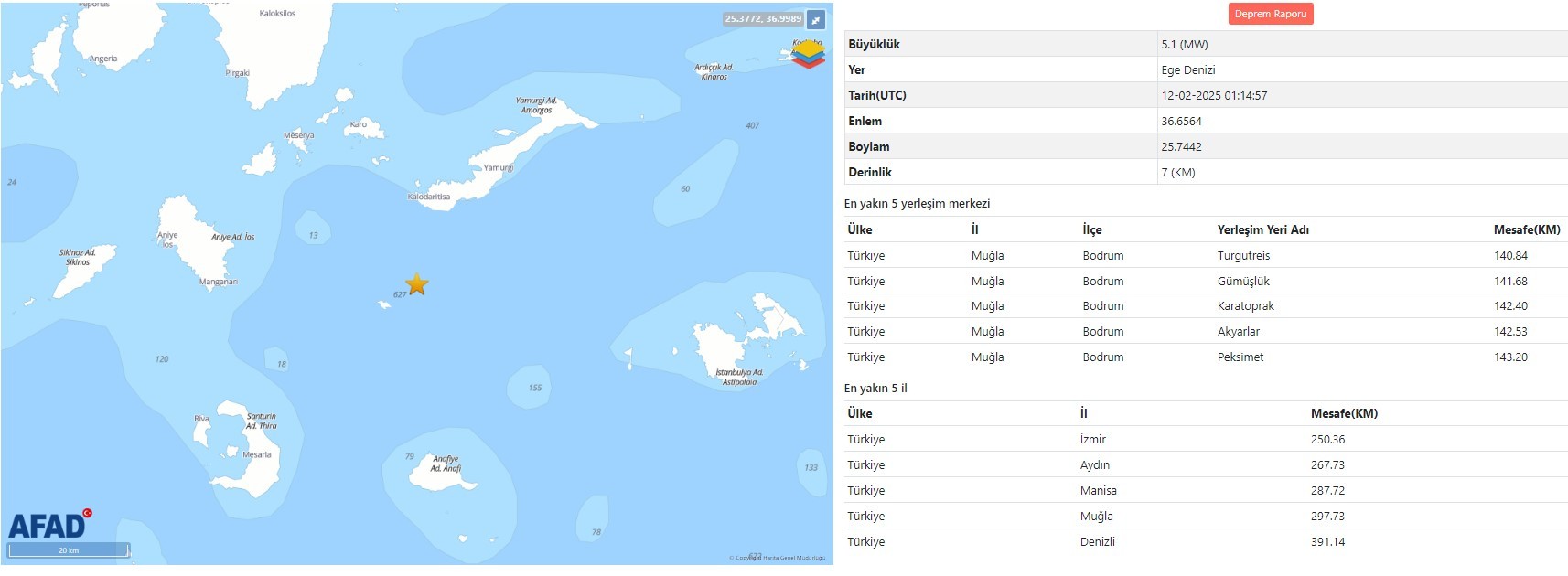 Afet ve Acil Durum Yönetimi Başkanlığı'ndan (AFAD) alınan bilgiye göre, saat Ege Denizi'nde 04.14'de 5.1 büyüklüğünde bir deprem daha meydana geldi. Richter ölçeğine göre yerin 7 kilometre altında kaydedilen sarsıntı, Muğla'nın Bodrum ilçesine 140.84 kilometre, İzmir'e ise 250.36 kilometre uzaklıkta meydana geldi.