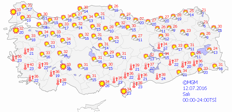 Meteoroloji Genel Müdürlüğü'nden alınan tahminlere göre, hava sıcaklığının yurt genelinde mevsim normallerinin üzerinde seyredeceği tahmin ediliyor. Rüzgar, genellikle kuzeyli, Akdeniz kıyılarında batı ve güneybatı yönlerden hafif, ara sıra orta kuvvette, Marmara, Ege Kıyıları, Batı Karadeniz kıyıları, İç Anadolu'nun doğu kesimleri, Doğu Anadolu'nun iç ve batı kesimleri ile Güneydoğu Anadolu'nun kuzey ve doğusunda kuvvetlice (30-50 km/sa) esmesi bekleniyor. Bazı illerde beklenen hava durumuyla günün en yüksek sıcaklıkları ise şöyle: