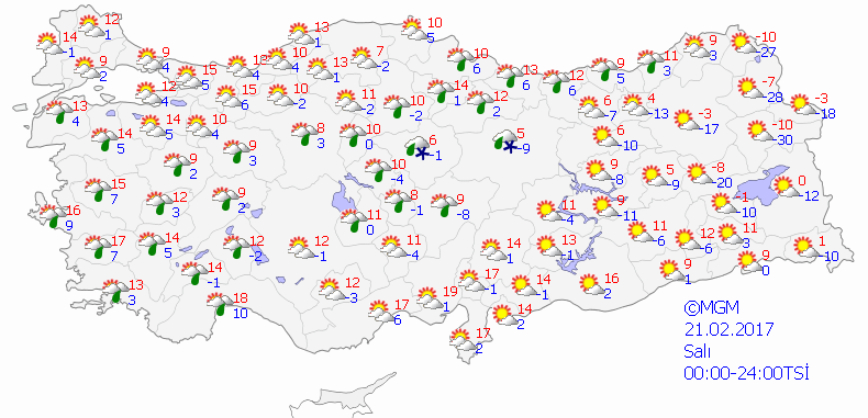 Yapılan son değerlendirmelere göre, ülkenin kuzey, iç ve batı kesimlerinin parçalı ve çok bulutlu, Ege, Batı Akdeniz, İç Anadolu'nun kuzeyi ile Bursa, Bilecik, Balıkesir, Aksaray, Kayseri, Ordu, Amasya, Tokat, Giresun, Trabzon ve Rize çevrelerinin aralıklı yağmur ve sağanak yağışlı, diğer yerlerin az bulutlu ve açık geçeceği tahmin ediliyor. Bu sabah ve gece saatlerinde iç ve doğu kesimlerde yer yer pus hadisesi ile birlikte buzlanma ve don olayı bekleniyor.
