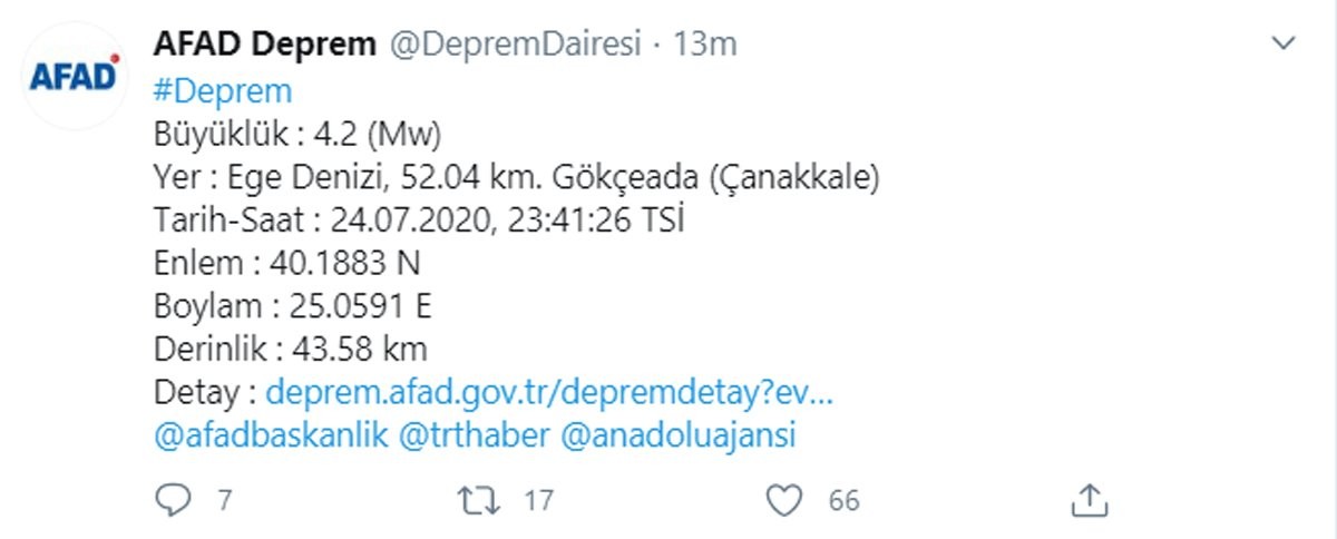 Ege Denizi'nde Gökçeada açıklarında saat 23.41'de 4,2 büyüklüğünde bir deprem meydana geldi.