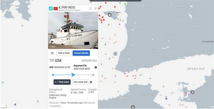 Cumartesi sabahı, Marine Traffic’e göre (haritadaki yuvarlak işaret), Piri Reis Bozcaada’nın güneyinde bulunuyordu.