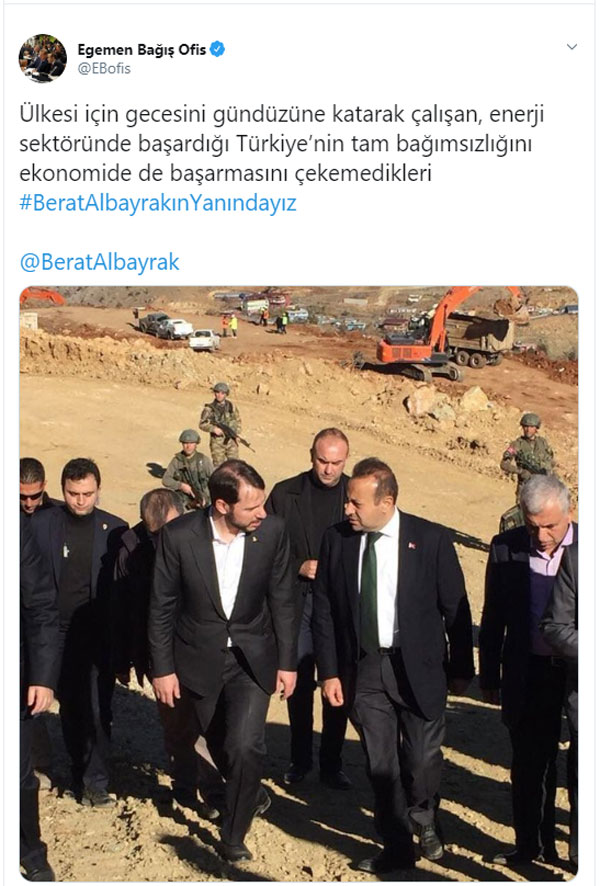 Albayrak’a destek mesajı yayınlayan isimlerden biri Avrupa Birliği Devlet eski Bakanı ve Türkiye Cumhuriyeti Prag Büyükelçisi Egemen Bağış oldu. Bağış Twitter hesabından yayınladığı mesajında, “Ülkesi için gecesini gündüzüne katarak çalışan, enerji sektöründe başardığı Türkiye’nin tam bağımsızlığını ekonomide de başarmasını çekemedikleri #BeratAlbayrakınYanındayız” ifadelerini kullandı.