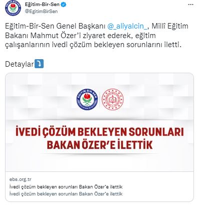 Eğitim-Bir-Sen ve Memur-Sen Genel Başkanı Ali Yalçın, Eğitim-Bir-Sen Genel Sekreteri Latif Selvi ve Genel Başkan Yardımcısı Hasan Yalçın Yayla ile birlikte, Millî Eğitim Bakanı Mahmut Özer’i ziyaret ederek, eğitim çalışanlarının ivedi çözüm bekleyen sorunlarını iletti.