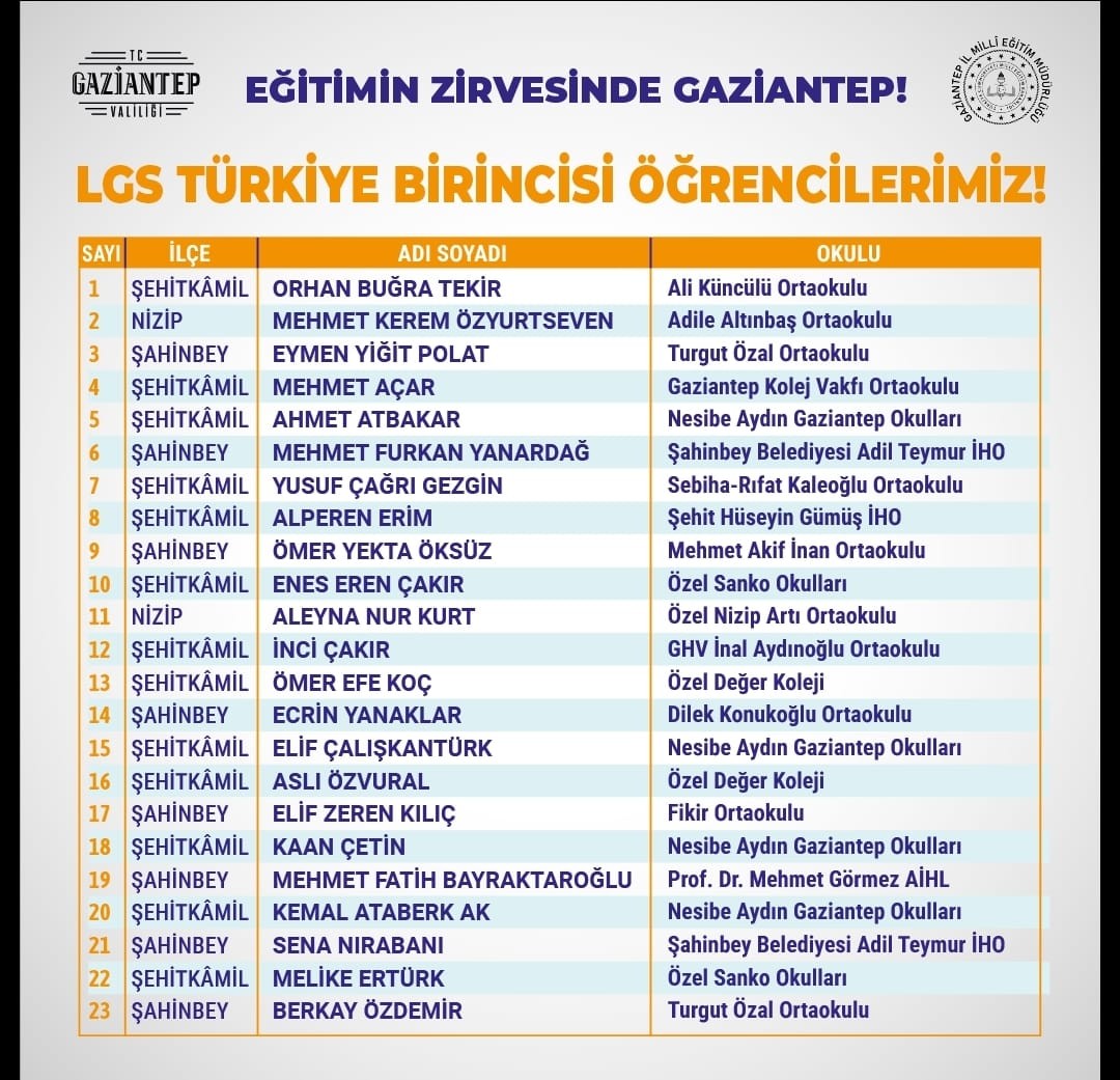 Gaziantep’te Türkiye birincisi olan 23 öğrenciŞahinbey, Şehitkâmil ve Nizip ilçelerinin farklı mahallelerinden çıktı. Ertuğrulgazi Mahallesi’nden Pirsultan Mahallesi’ne, Karataş Mahallesinden Değirmiçem Mahallesine kadar birçok mahallede devlet okullarında yüksek başarı gösteren öğrencilerin olması, Gaziantep’in eğitim kalitesinin tabana yayılmış şekilde her yerde arttığını göstermektedir.
