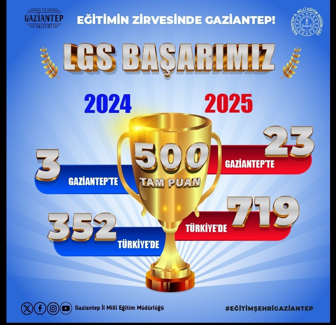 Gaziantep, MEB tarafından ortaokuldan liseye geçişte uygulanan merkezî sınavlarda en yüksek Türkiye birinciliği sayısına bu yıl ulaşarak tarihi bir başarıya imza attı. 2024 LGS sınavında Türkiye geneli tam puan alan 352 öğrenciden sadece 3’ü Gaziantepli öğrenciler iken bu sayı 2025 yılında yaklaşık 8 kat artarak 23’e yükseldi. Sanayi ve ticarette ülkemizin öncü şehri olan Gaziantep, bu başarısı ile eğitim alanında da öncü bir şehir olduğunu gösterdi.