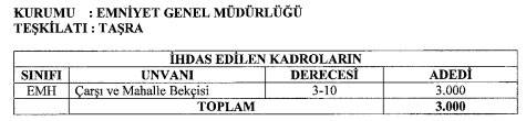 Son dakika haberi: Binlerce adayın beklediği bekçi alımlarına izin çıktı. Resmi Gazete'de yayımlanan Cumhurbaşkanı kararına göre Emniyet Genel Müdürlüğü taşra teşkilatında görevlendirilmek üzere 3000 yeni bekçi alımı yapılacak. 3000 yeni bekçi alımına ilişkin karar Resmi Gazete'de yayımlandı. Cumhurbaşkanlığı Kararnamesi ile Emniyet Genel Müdürlüğüne 3 bin çarşı ve mahalle bekçisi kadrosu ihdas edildi.