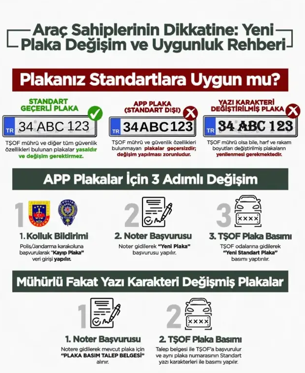 APP (standart dışı) plaka kullanımı durumunda plaka değişimi veya yeniden basım gerektiği belirtilerek, "Standart ölçülere uygun olmayan, üzerinde mühür ve diğer güvenlik özellikleri bulunmayan ve mevzuata aykırı şekilde basılmış APP plakaların kullanımı yasaktır. Bu durumda araç sahiplerinin, polis veya jandarma birimlerine başvurarak kayıp/tespit işlemi yaptırması, noter aracılığıyla yeni plaka başvurusunda bulunması, TŞOF tarafından yetkilendirilen birimlerde plakalarını bastırmaları gerekmektedir." ifadelerine yer verildi.