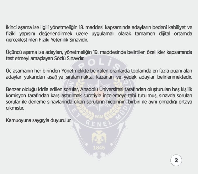 EGM’nin internet sitesinden yapılan yazılı açıklamada, Anadolu Üniversitesi tarafından oluşturulan beş kişilik komisyonun benzer olduğu iddia edilen soruları incelediğini ve “sınavda sorulan sorular ile deneme sınavlarında çıkan soruların hiçbirinin, birbiri ile aynı olmadığı” sonucuna ulaşıldığı belirtildi.